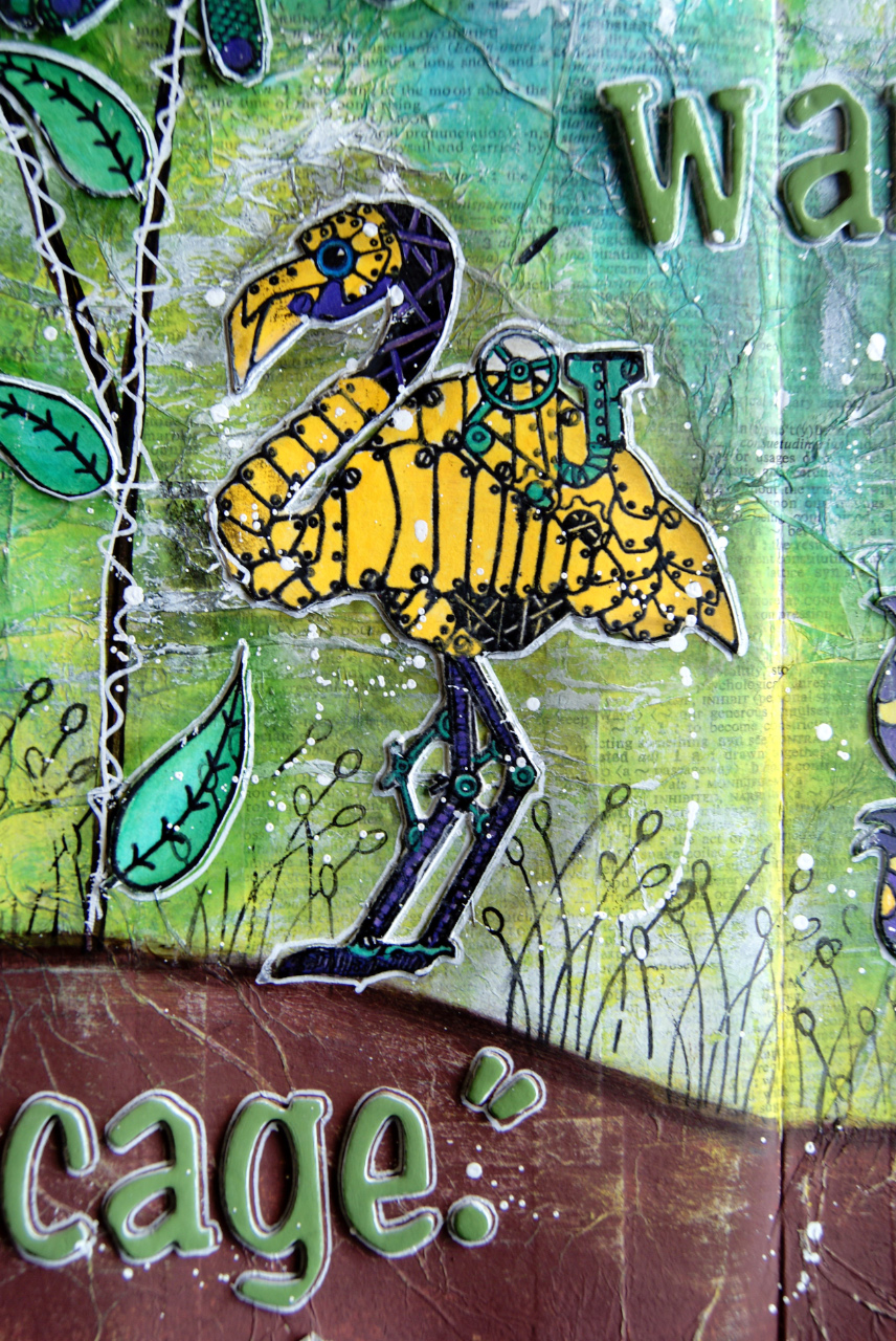 I have then stamped on heavy duty cardstock the images, coloured them in with Dylusions paint pens. I then fussy cut them out and stuck them onto the art journal page. I apologise for no photos of this step but technology got the better of me - again!
